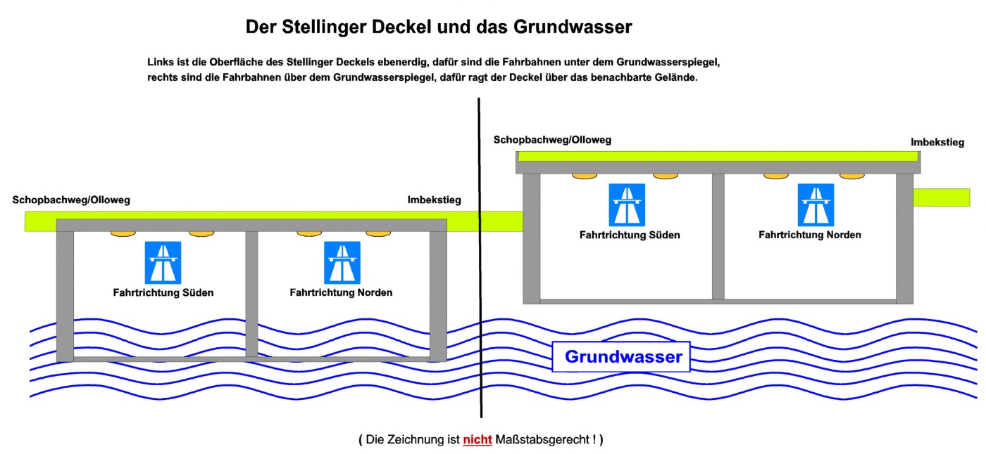 Die Sicherheit im Stellinger Tunnel ist nicht gegeben wegen Feuergefahr und fehlenden Fluchtwegen nach oben (durch den breiteren Tunnelquerschnitt und kürzeren Abständen zu den Fluchttüren ist eine höhere Sicherheit für die Fahrzeuginsassen bei möglichen Unfällen im Tunnel gegeben. Selbst die Feuerwehr bestätigt bei Gesprächen zum Planfeststellungsbeschluss die Sicherheit. Die Vorschriften für Straßentunnel werden mehr als erfüllt. (Einzelheiten, siehe oben)).